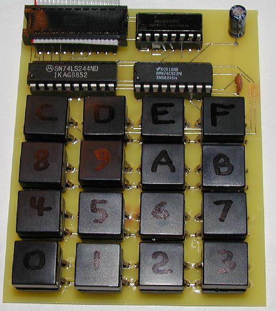This is the prototype hex keypad for the Micro/Elf. The keypad is used by removing the 74244 on the Micro/Elf board and plugging the keypad cable into the 74244 socket.