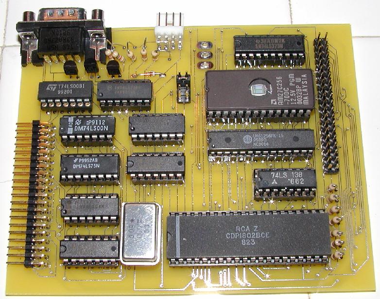 This is the prototype for my Pico/Elf project. This machine was designed as the smallest fully functional Elf class computer. The definition for fully functional was that it must run Elf/OS. This board has 32k of RAM, 32k ROM containing the Elf/OS install package and my BIOS, a Q/EF? (jumper selectable) serial port, the 8-bit IDE/CF interface, and Micro/Elf version 2 expansion bus.