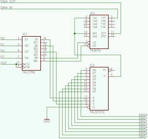 This circuit provides a means to add up to 8 DMA devices to an 1802 based computer. The selector also allows you to specify whether a DMA request will trigger the DMA_IN or DMA_OUT of the cpu.