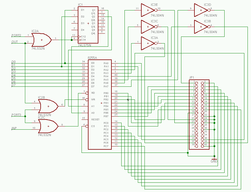 This circuit is utilized by selecting an 8255 port by writing port2 and then reading/writing the selected 8255 port on port 3. PB of the 8255 provides the low 8 bits to the IDE device, while PC provides the high 8 bits.